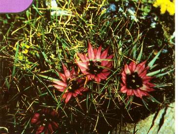 形态特征:菊科凤毛菊属一年生或二年生草本植物。根圆锥状。无茎。叶多数,莲座状,线形,长6-19厘米,宽5-15毫来,全缘,基部扩大,紫红色。7-8用开花,头状花序无梗,多数,密集呈半球形;总苞圆简形,长10-12毫米,总苞片长圆形,顶端钝,紫红色、有睫毛,边缘膜质;小花长10-15毫米,管部长为檐部的两倍,冠毛白色。瘦果长3-4毫米,顶端具膜质的冠状边缘。