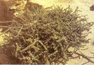 形态特征:藜科猪毛菜属一年生草本植物,高30-100厘米。茎直立,自基部分枝,茎、枝生短硬毛,有白色或紫红色条纹。叶互生,叶片半圆柱形或圆柱形,长].5-4厘米,宽1-1.5毫米,顶端有刺状尖,基部扩展处的边缘膜质。8-9月开花,花序穗状,生于枝条的上部;苞片和小苞片的顶端有刺状尖;花被片长卵形,膜质,无毛;花被片果时变硬,自背面中部生翅,翅3个较大,肾形或倒卵形,膜质,2个较狭窄,花被果时(包括翅)直径7-10毫米。