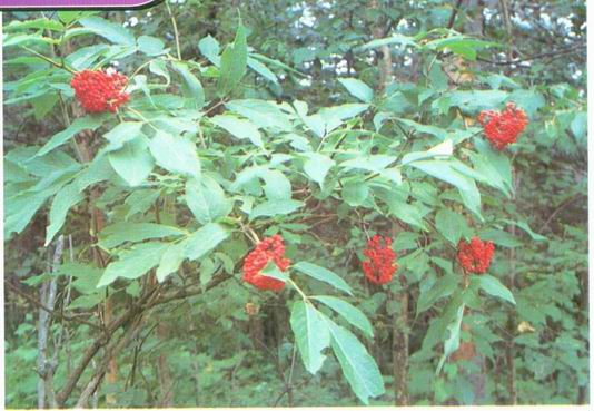 形态特征 忍冬科接骨木属灌木式小乔木植物,高达6米。茎髓心淡黄棕色。叶对生,奇数羽状复叶,小叶(3-)5-7(-11),椭圆形或长圆状披针形,长5-12厘米,急尖,基部常不对称,边缘具锯齿,揉碎后有臭味。6-7月开花,圆锥花序顶生,长达7厘米;花小,白色至淡*;萼筒杯状,长1毫米,萼齿三角状披针形;花冠辐状,裂片5,长2毫米。浆果状核果近球形,直径3-5毫米,红色或黑紫色。