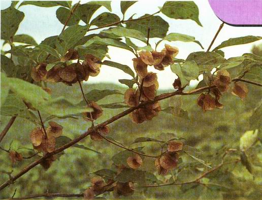 形态特征:忍冬科双盾木属灌木至小乔木植物,高达6米。叶对生,卵形至卵状椭圆形,长5-10厘米,顶端渐尖至长渐尖,基部圆形至楔形,全缘。4-5用开花,单花的聚伞花序生于短枝叶腋,似呈伞房状;花白色至粉红色;花梗细长有柔毛,顶端有2苞片和2小苞片;萼筒具5枚钻状条形的裂片;花冠下部筒状,上部钟状,长2.5-3厘米,裂片5。果具宿存苞片和小苞片,小苞片近圆形,直径达2厘米,以其中部贴生于果实,似双盾。