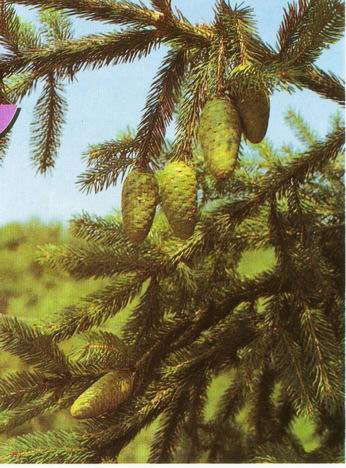 形态特征: 松科云杉属常绿乔木植物,高15-25米,胸径50厘米。树皮灰色,裂成鳞片状脱落。小枝上面的叶向上伸展、下面的叶辐射伸展或小枝下面和两侧的叶向上弯伸,钻形,长1.5-2.5厘米,宽约2毫米。球果长圆状圆柱形或卵状圆柱形,下垂,长8-14厘米,直径5-6.5厘米,成熟时淡褐色或褐色;种鳞斜方状五角形,长2-2.7厘米,宽2-3厘米、顶端宽圆形或近三角形;苞鳞短小,长约5毫米;种子倒卵圆形,长5-6毫米,种翅宽大,倒卵状。