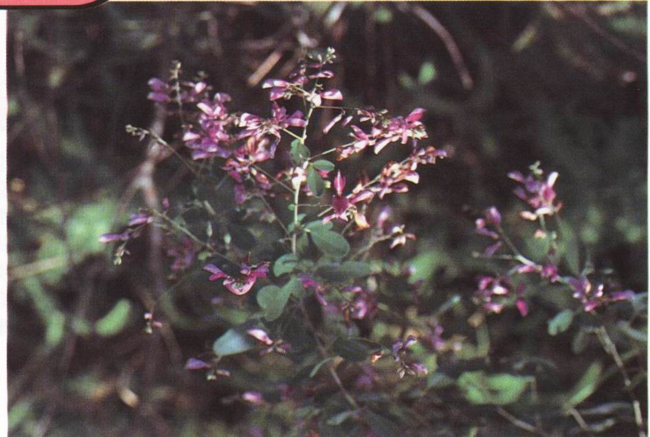 形态特征:豆科胡枝子属灌木植物,高0.5-2米。3小叶,顶生小叶宽椭圆形或卵状椭圆形,长3-6厘米,宽1.5-4厘米,先端圆钝,有小尖,基部圆形,上面疏生伞状短毛,下面毛较密;倒生叶较小。总状花序腋生,花冠紫色,旗瓣长约1.2厘米,无爪,翼瓣长约1厘米,有爪,龙骨瓣与旗瓣等长,基部有长爪。荚果斜卵形,长约10毫米,宽约5毫米,网脉明显,有密柔毛。