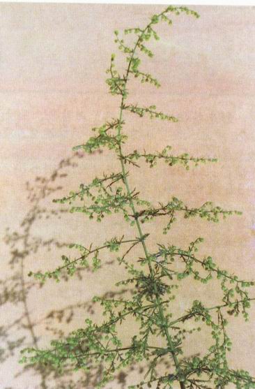 形态特征:菊科篙属一年生草本植物。茎直立,高50-150厘米,多分枝。基部及下部叶花期枯萎,中部叶卵形,三次羽状深裂,长4-7厘米,宽1.5-3厘米。头状花序极多数,球形,排列成总状及复总状。花筒状、长不过l毫米,外层雄性,内层两性。瘦果矩圆形,长0.7毫米。