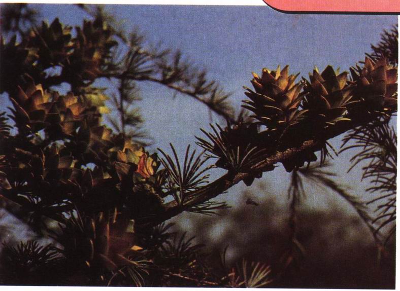 形态特征 松科金钱松属落叶乔木植物,高达40米,胸径可达1.5米,树干通直。树皮灰色或灰褐色,裂成鳞片状块。枝平展,不规则轮生。叶在枝上螺旋状散生,在短枝上20-30枚簇生,伞形平展,线形或倒披针状线形,柔软,长3-7厘米,宽1.5-4毫米,下面沿中脉两侧具两条灰色气孔带。雌雄同株,球花生短枝顶端,具柄;雄球花20-25个簇生;雌球花单生,苞鳞大于珠鳞。球果卵圆形,长6-7.5厘米,直径4-5厘米,成熟时淡红褐色。种子卵圆形。