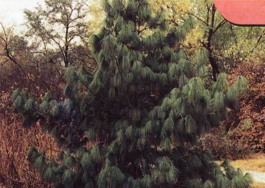 形态特征:松科松属常绿乔木植物。一年生枝绿色,干后变褐色。针叶5针一柬,下垂,长10-20厘米。球果圆柱形,长15-20厘米,淡褐色或暗褐色。种子褐色或黑褐色,长倒卵形,长7-8毫米,直径4-5毫米,有结合而生的膜质长翅,约2厘米。