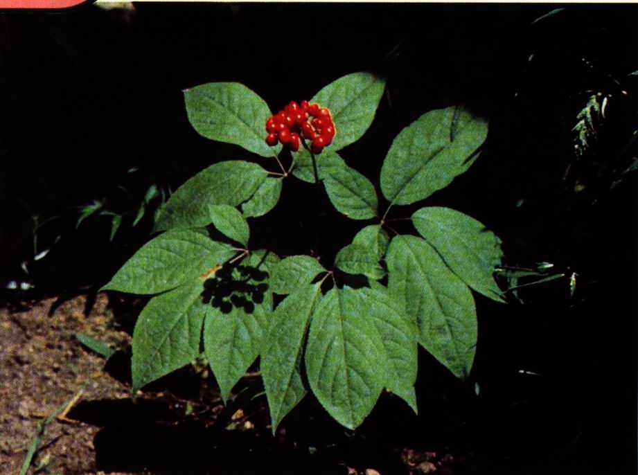形态特征:五加科人参属多年生草本植物。根状茎短。主根肥大,纺锤形或圆柱形。地上茎单生,高30-60厘米。叶为掌状复叶,3-6枚轮生顶端;小叶片3-5枚。伞形花序单个项生,直径约1.5厘米,有花30-50朵;花淡黄绿色;花瓣5。果实扁球形,鲜红色。