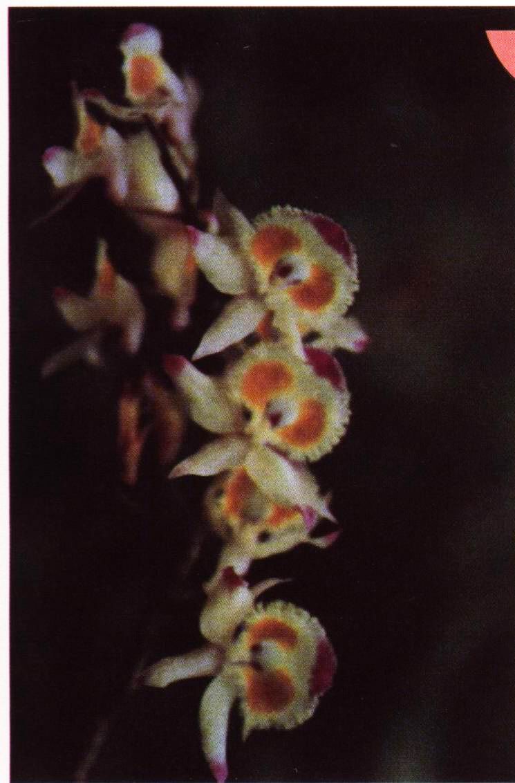 形态特征:兰科石斛属附生多年生草本植物。茎长30-50厘米,直径5-7毫米,具节,下垂。叶互生,披针形,长4-7厘米,宽6-15毫米,顶端长渐尖,花期叶凋落。4-5月开花,总状花序常常具2朵花,很少仅具1或3朵花,总花梗长约5毫米;花被片白色或黄白色,顶端紫色; 花瓣边缘具细齿;唇瓣肾状圆形,边缘具流苏,内面被毛,在基部具2个*大的斑块。