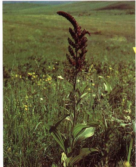 形态特征: 百合科藜芦属多年生草本植物,高60-100厘米。茎粗壮。叶椭圆形,长20-25厘米,宽5-10厘米。圆锥花序,侧生总状花序为雄花,顶生花序具两性花,小花多数密生,花被片黑紫色。蒴果长1.5-2厘米。宽约1厘米,花期7-8月;果期8-9月。