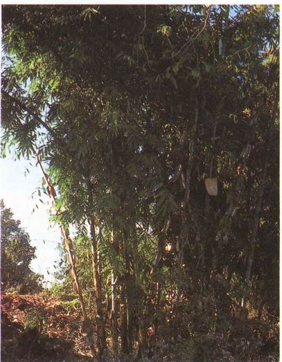 形态特征:禾本科牡竹属植物。秆高20-30米,直径20-30厘米。梢端柔弱下垂。叶长圆状披针形。大型花枝上具有球状簇生的小穗。