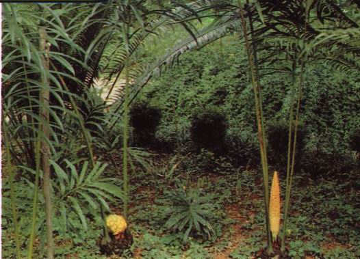 形态特征:苏铁科苏铁属常绿棕榈状植物。树干圆柱形,高达4米。叶螺旋状排列,叶片羽状全裂,长2-3米,叶柄两侧具短刺;叶羽片叉状分裂,裂片线状披针形,长20-30厘米,宽2-3厘米,基部不对称,边缘波状。小孢子叶球圆柱形,长15-18厘米,直径约4厘米,梗长3厘米,粗1.5厘米 小孢子叶近匙形或宽楔形,*,边缘橘*,长1-1·8厘米,宽约8毫米,下面有多数3-4枚聚合而生的小孢子囊;大孢子叶橘*,长约8厘米,下部长柄状,上部蓖齿状分裂,裂片钻形。