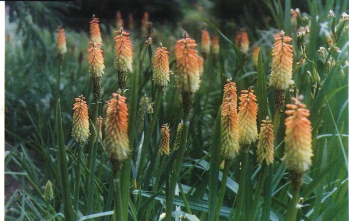 形态特征:百合科火把莲属多年生草本植物,株高80-120厘未。茎直立。叶线形。总状花序着生数百朵筒状小花呈火炬形,花冠橘红色,花期6-7月。蒴果黄褐色,果期9月。