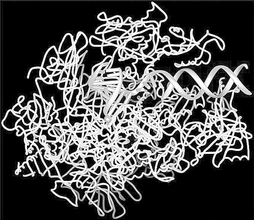 这张图片是怎么创建的呢?科恩伯格采用了一个绝妙的方法。在RNA链的形成过程中,他从溶液中取走其中一个必需的碱基对,导致RNA链在需要这个碱基对的插入时因找不到它而将转录过程停止,然后创建出这些分子的晶体,再用X射线拍照,利用这种照片,计算机计算出分子中原子的真正位置,这张图片就是由一台计算机这样制作出来的。