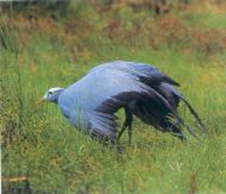 全世界共有15种鹤,而蓝鹤(Anthropoide sparadiseus)是非洲所拥有的6种鹤之一。它高雅而美丽的外貌给人留下深刻的印象。它有多层柔美而悠长的羽毛,由此构成特别长的“内翅”(*飞翔),乍一看,会使人以为它有很长的尾翼,其实不然。大多数鹤类在头部和脸部都会有艳丽的装饰,最典型的就是头部有红色羽毛或者红色的裸皮,而全身羽毛球则纯黑或纯灰、纯白,偶尔会间以明显的条纹,或配有精美的鸟冠。可是在这方面,蓝鹤却非常朴实无华。它的头形很一般,仿佛只给自己挑选了一项朴素无沿的便帽。但头后部的羽毛却长得特别长,顺顺滑滑地构成一个弧形,使头部看起来非常圆润,也将颈子衬托得特别纤细。
