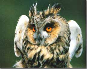 领角?^ 领角?^属于鸱?^科,小型猛禽。全长25厘米左右。上体及两翼大多灰褐色,体羽多具黑褐色羽干纹及虫蠹状细斑,并散有棕白色眼斑。额、脸盘棕白色;后颈的棕白色眼斑形成一个不完整的半领圈。飞羽、尾羽黑褐色,具淡棕色横斑。下体灰白,嘴淡黄染绿色。爪淡*。