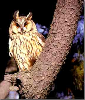 长耳?^ 长耳?^别名长耳猫头鹰、夜猫子,属于鸱?^科,中型猛禽。全长38厘米左右。体羽棕*,上体密布黑褐色粗羽干纹和虫蠹状细斑。面盘中部白而缀黑,侧部棕黄;耳羽黑褐色,长约5厘米,飞羽黑褐或灰褐,尾羽基部棕褐色,胸、上腹及两胁杂以黑褐色羽干纹。嘴铅褐色,先端黑色。爪黑色。