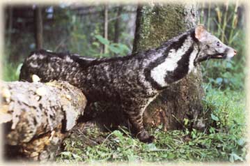 小灵猫 别名: 七节狸、笔猫、乌脚狸、香猫 学名: Viverriculaindica 英文名: small indian civet 灵猫科 Viverridae,分布长江流域以南及海南、台湾、西藏 中国保护等级:国家二级保护动物 小灵猫外形与大灵猫相似而较小,体重2~4千克,体长46~61厘米,比家猫略大,吻部尖,额部狭窄,四肢细短,会阴部也有囊状香腺,雄性的较大。肛门腺体比大灵猫还发达,可喷射臭液御敌。全身以棕*为主,唇