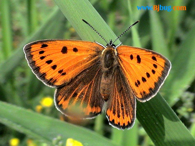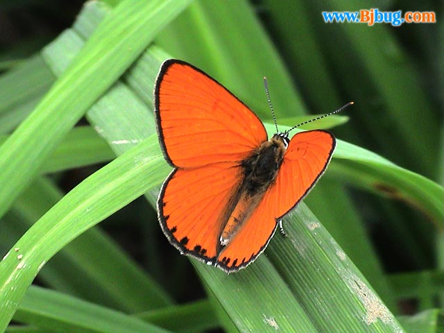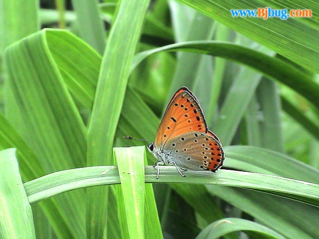 4昆虫种名:橙灰蝶 Lycaena dispar Hauorth 4所属类别:鳞翅目 灰蝶科 4拍摄时间:2001.09.12 拍摄地点:香山 4简要介绍:雌雄异型,雄蝶前翅翅面橙色,顶角向边缘有窄的黑带;后翅基部和臀缘有较宽的黑色区; 雌蝶前翅翅面橙色,中室内有2个黑斑,后翅黑褐色。 成虫喜访花。 4虫体大小:翅展35-38mm 4区域分布:北京、河北、陕西、青海;欧洲