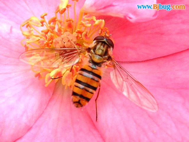 4昆虫种名:黑纹食蚜蝇 Episyrphus balteatus 4所属类别:双翅目 食蚜蝇科 4拍摄时间:2001.06.30 拍摄地点:紫竹院 4简要介绍:成虫体*,有宽窄相间的黑条纹;成虫经常群集于植物上,采集花粉和花蜜;幼虫以蚜虫为食。 4虫体大小:体长10mm 4区域分布: