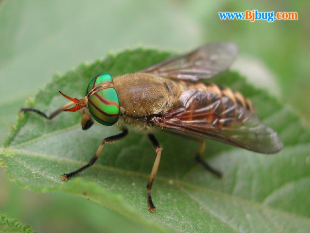 4昆虫种名:未知种类(F) 4所属类别:双翅目 虻科 4拍摄时间:2002.06.18 拍摄地点:金山 4简要介绍:雌性的复眼分开,吸食血液。 4虫体大小:体长15mm,翅展20mm 4区域分布:
