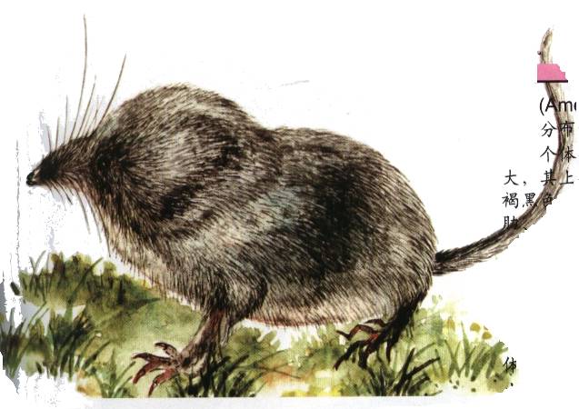 个体大,体长46-100毫米,体重12.3-15.4克,后足 大,其上具硬毛,中趾成蹼状,毛极柔软和润泽。体上为暗 褐黑色,体下为银白至棕色;尾双色,下半部为银白。雄性 肋、腹部具有分泌腺。