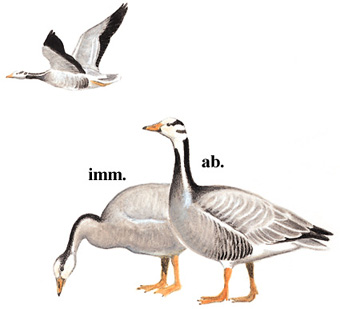 物种特征:描述:体型略小(70厘米)的雁。顶白而头后有两道黑色条纹为本种特征。喉部白色延伸至颈侧。头部黑色图案在幼鸟时为浅灰色。飞行中上体均为浅色,仅翼部狭窄的后缘色暗。下体多为白色。 虹膜-褐色;嘴-鹅黄,嘴尖黑;脚-橙黄。 叫声:飞行时为典型雁叫,声音为低沉鼻音。 分布范围:繁殖于亚洲中部,在印度北部及缅甸越冬。 分布状况:繁殖于中国极北部及青海、西藏的沼泽及高原泥淖,冬季迁移至中国中部及西藏南部。 习性:耐寒冷荒漠碱湖的雁类。越冬于淡水湖泊。