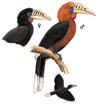 物种特征:描述:中等体型(117厘米)的深色犀鸟。盔突极小,嘴暗淡*,眼周裸皮蓝色,喉囊红。雄鸟头及下体棕色;雌鸟近黑。两性初级飞羽羽端及后半段尾羽均为白色。 虹膜-略红;嘴-*;脚-近黑。 叫声:雄雌两性均发出轻声啸叫Kup,声不如双角犀鸟深沉。 分布范围:喜马拉雅山脉从尼泊尔至中国西南、缅甸北部及印度支那。 分布状况:罕见。在云南南部西双版纳南端及西藏东南部有分布记录。 习性:较其他犀鸟更喜山区环境,栖于海拔600 ~1800米的常绿林。