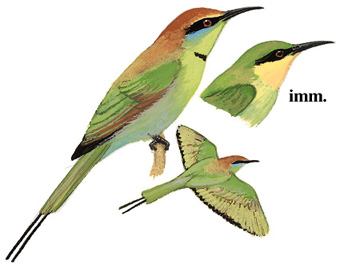 物种特征:描述:体小(20厘米)的绿色蜂虎。尾形延长,头顶及枕部铜色,喉及脸侧淡蓝,前领黑。与栗头蜂虎区别在喉蓝色,尾形延长。与蓝喉蜂虎区别在尾及腹部绿色,前领黑色。 虹膜-绯红;嘴-褐黑;脚-黄褐。 叫声:比其他蜂虎具更高的多金属音质颤音。停栖或飞行时发出响铃般悦耳的tree-tree-tree或tit-tit-tit声。 分布范围:非洲、中东至中国西南部及东南亚。 分布状况:不常见。繁殖于中国云南西部及南部的低海拔地区。 习性:栖于干燥的开阔原野,上至海拔1500米。以小群从枯树上捕食。喜泥浴。