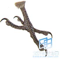 因为鸟类飞行的原因,鸟类在除腿的顶端到接近重心的中心部位演化出一些肌肉,这些与我们人类有些不同。鸟类腿上可以分为三部分。股骨的肌肉相对较短且埋藏深。组成股关节到脚踝是等价的部分。这部分被严格地称为胫跗骨,不能完全和我们的小腿相比较。第三部分就是最下端部分,通常称之为跗跖骨,是脚上部暴露的基本骨骼。这部分骨骼也是鸟类最容易看到的大部分骨骼,常常把它称为腿骨。也是真正与人类的踝骨相等价的部分,很显然从形态学上的膝关节是不存在的,那里位于腿骨的高处部分被羽毛隐藏。
