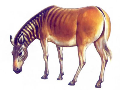 美丽的斑马对现代人来说人尽皆知,而人们对亮丽的斑驴则知之甚少,因为早在1883年,斑驴已经从地球上永远消失了。斑驴身上的条纹不象斑马那样遍布全身,只是头到身体的前半部有条纹,并且脖颈上的条纹延伸到它短而立直的棕毛上。它的身体后半部为黑色,而腹部和四肢却为白色。斑驴脖子长,头也长,而耳朵却非常短小。斑驴的眼在脑颅的后方,这使它视野开阔,白天的视觉非常敏锐,夜晚也可和狗、猫头鹰的视觉相媲美。斑驴一般体长2.7 m,尾巴近1 m,重约410 kg。