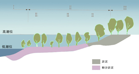 红树林是生长在海水中的森林,是生长在热带、亚热带海岸及河口潮间带特有的森林植被。它们的根系十分发达,盘根错节屹立于滩涂之中。它们具有革质的绿叶,油光闪亮。它们与荷花一样,出污泥而不染。涨潮时,它们被海水淹没,或者仅仅露出绿色的树冠,仿佛在海面上撑起一片绿伞。潮水退去,则成一片郁郁葱葱的森林。