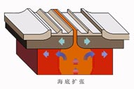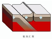 由于地幔的对流运动,使得漂浮在它上面的板块也被带动做水平运动。所以,地幔的热对流是带动板块运动的传送带。板块从大洋中脊两侧各自做分离的运动。这运动的板块最终总会有相遇的,相遇相互碰撞,当大洋板块与大陆板块相碰撞,大洋板块密度大而重,就插到大陆板块之下,在碰撞向下插入处就形成大洋边缘的深海沟。假使是两个大陆板块相碰撞,则互相挤压,使两个板块的接触带挤压变形,形成巨大的山系,如喜马拉雅山系就是欧亚板块与印度板块挤压而形成的。因此,大洋底部的运动,形成大洋边缘岛弧海沟复杂的地貌,也构成大陆上巨大的山系,板块构造控制了整个地球的地表形态。