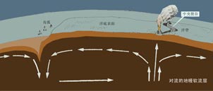 板块为什么会运动,它的动力来自何处? 目前的科学知识告诉我们,主要是地幔深处的热对流作用。地球深部的核心称地核,它是高温熔融的。它使地核外围的地幔加温,地幔温度很高,靠近地核的岩层也熔化。地幔下部的导热性不能有效地将地核的热量散发出去,使热量积聚,致使地幔逐渐升高温度,地幔物质成为塑性状态,形成对流形式的运动。地幔的热对流是在大洋中的海底山脉(又称洋中脊)处上升。沿着海底水平运动,到大洋边缘的海沟岛弧带,随着水平长距离运动而冷却,而沿海沟带下沉,又回到高温的地幔层中消失。