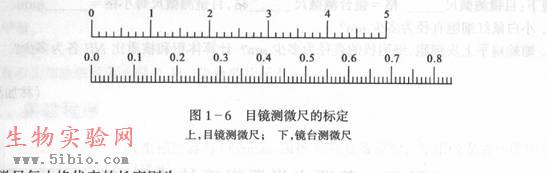 3. 小心移动镜台测微尺和目镜测微尺(如目镜测微尺刻度模糊,可转动目镜上透镜进行调焦),使两尺左边的"0"点一直线重合,然后由左向右找出两尺另一次重复的直线(图1-6)。