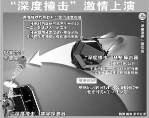 如果一切顺利,酒桶般大小、重达369公斤的铜制撞击器,在脱离了母船“深度撞击号”飞行器之后,将在美国宇航局加州帕萨迪纳喷气推进实验室的操控下,直奔“坦普尔-1”彗星而去。撞击前的两个小时,它将启动自动导航仪并