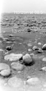 此图由惠更斯探测器于一月十四日发回。这是一幅彩色图,是对相关数据进行处理加上反射光谱数据以后获得的,比较接近土卫六地表的实际颜色。图中显示的物体初步判断为石块或冰块,形状类似卵石。图片中央下方有两个石块状物体,左边一块大约十五厘米宽,中间一块大约四厘米宽,距离惠更斯探测器大约八十五厘米。土卫六表面比预计的更黑暗,惠更斯所在表面是由冰及碳氢化合物冰构成的混合物。从图示物体表面的被侵蚀痕迹可以看出,土卫六表面可能存在过流动液体。