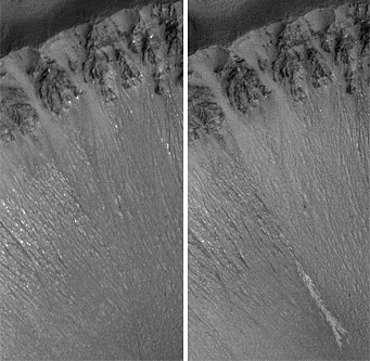 火星环球勘探者号相隔6年拍摄的两张照片,上面有新近流水的强烈证据