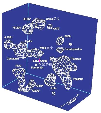 星系团在大范围空间是怎样分布的,宇宙在大尺度上有什么结构?近20多年来,宇宙大尺度结构的观测研究取得了重大进展,由各星系的光谱线红移可以得出它们的‘退行(远离)’速度,再用“哈勃定律“求出距离,可以画出星系分布的三维图。上图画的是我们银河系所在的‘本星系群’(靠近中央的粉线所指小白斑点)周围的星系团的空间分布,标尺的Mpc是百万“秒差距”(1秒差距=3.26光年=30.86万亿公里)。此图的所有星系团组成“本超星系团”,其中心大致在室女星系,而本星系群离中心约1800万‘秒差距’。 好象把西瓜切成片来看瓜籽的空间分布那样,下面的上图是宇宙的一‘瓜’片的星系(以黑点表示)空间的分布,银河系画在圆心,省略了‘瓜’片的厚度,半径代表星系距离(或‘退行’速度)。它的星系密
