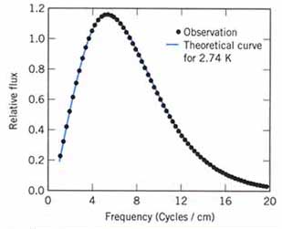 图5 COBE卫星获得的微波背景辐射谱特性与2.74K黑体谱非常符合。图中的黑点是观测值,淡蓝色的曲线是2.74K黑体的理论曲线。
