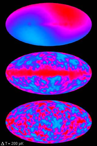 图6 COBE卫星获得的宇宙背景微波辐射的图像。上图是偶极各向异性现象。中图是消除了多普勒效应后的图像,图中心的横条是来自银河系的微波辐射。下图是消除了银河系的辐射后所显示出的宇宙中的密度的起伏。