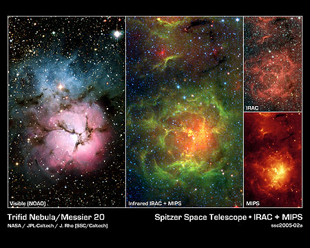 “斯必泽”拍摄的不同红外波段的人马座三叶星云(图中和右的3幅)与光学照片(图左)的比较。光学照片中将星云分为三个部分的暗线在红外照片里都变得明亮起来。“斯必泽”在三叶星云里发现了许多新生的恒星,在照片中呈现为红色或者*。