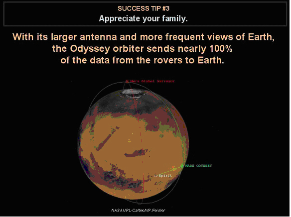 利用其巨大的天线和与地球间更频繁的通讯联系,火星车发回的数据几乎100%都是通过“奥德赛”轨道飞行器传回地球。