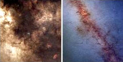 银河系中心天区10度的可见光照片(左)和红外照片(右)