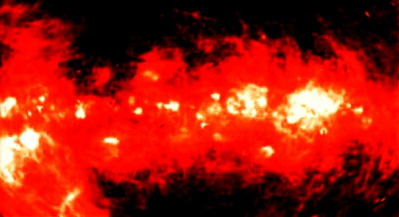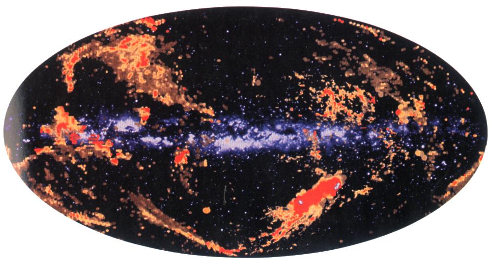 在深空的氢α发射(伪彩)图像上,银道面上下有弧形暖气体环和纤维。某些环似乎跟银盘内的恒星形成活动区成协。它们可能证明恒星际介质被一系列超新星爆发吹成大洞。