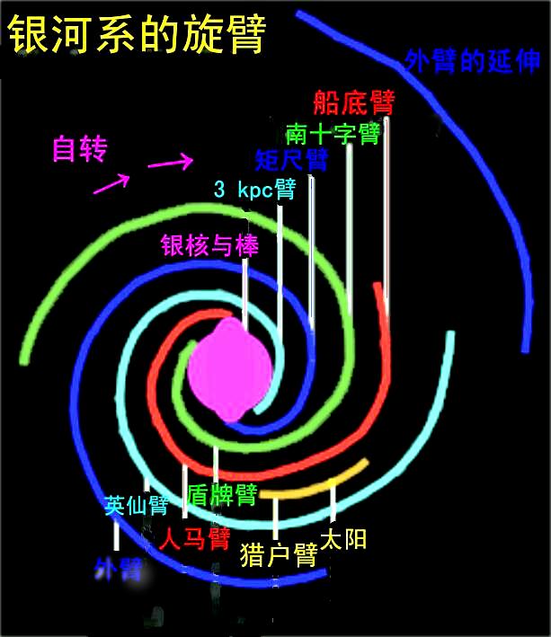 从分子气体环向外伸出旋臂,旋臂是大量热的年轻恒星、气体和尘埃集中并且是活跃的恒星形成区。应指出,在旋臂间和旋臂内几乎有同样多的恒星,只因旋臂内亮星多而更醒目。