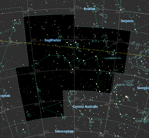 | 包含的梅西耶天体:M17 M18 M20 M21 M22 M23 M24 M25 M54 M28 M55 M69 M70 M75 M8 NGC-6440 NGC-6445 NGC-6603 NGC-6818 NGC-6822 |