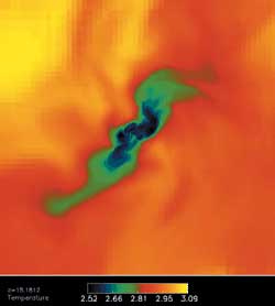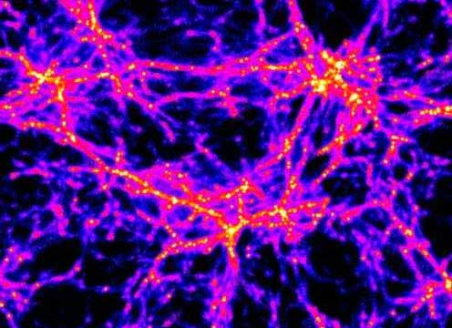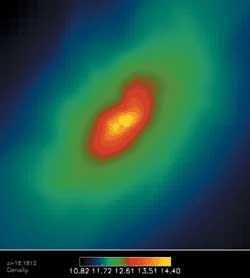 宇宙早期的电脑模拟图,红色部分为高密集区使用详细的计算机模拟,天文学家重新构建了第一颗星球形成的条件,甚至列出了后来其他星球形成的精确步骤序列,以及最终星系的形成。例如,天文学家猜测,由一个暗物质和气体所组成的密集的云形成了宇宙的第一颗星球。同时,他们认为,我们现在的星系是宇宙初期许多更小的星系合并后的产物。可是,要估算出第一颗星球的形成时间是十分苦难的,因为,即使最强的超级计算机每次也只能模拟宇宙的很小一部分。这个计算机模型由以色列特拉维夫(Tel Aviv)大学的天体物理学家瑞南·巴克纳和他的同事们共同创造。