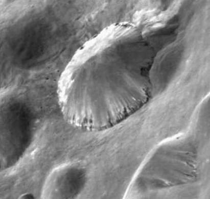 "卡西尼"号探测器向地球传送回土星卫星--土卫九的照片,从所示的两幅照片中可以清楚地看到由交错亮区和暗区组成的奇特地貌结构。科学家们认为,这些明暗"斑"的出现是由于土卫九与小行星或某些其他天体互相碰撞的结果,同时土卫九深色岩石凸现在地表上,与冰混杂在一起。