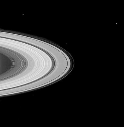 在照片发表之前,美国宇航局提高了照片的反差,以便能更好地区分细节。从另一幅照片中可看到土星光环(见图2),除了光环在照片上还可以看到点状土星卫星,从左向右是土卫一和土卫二。