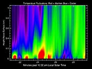 "勇气"号火星车测量了火星大气的温度范围,新数据表明火星气温的变化非常快。在清晨火星空气温度可以每分钟上升或下降4度,这是指地表附近局部地段的空气温度变化,那里的空气会快速被加热并上升。这很像地球上正在上升的气流,地球上的鸟类和三角翼滑翔爱好者喜欢利用这样的上升气流。