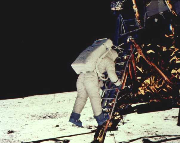 1969年7月21日格林威治时间3时51分,飞行指令长阿姆斯特朗爬出登月舱的气闸室舱门,在5米高的进出口台上呆了几分钟,以